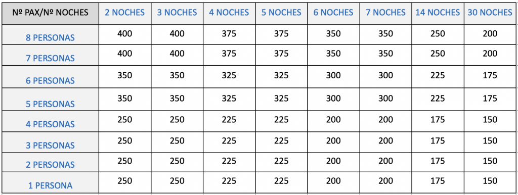 CASA COMPLETA (Máx 8 Per.) PRECIOS Y CONDICIONES – Estancia mínima 2 noches (consultar según temporadas). – Precios fuera de temporada: 400 €/día fines de semana y festivos 350 €/día noches de domingo a jueves. – Precios en temporada alta y descuentos por nº de personas y nº de días: consultar en la tabla de precios, el Tlf: 607-213924 o en escapadarural.com. – Se admiten mascotas de razas de compañía y peso inferior a 10 kg. (requiere fianza de 200 €). – Para reservas pedimos transferencia del 50% del precio total, el resto a la entrada. – Se admiten cancelaciones. (Ver condiciones en escapadarural.com) * Exclusividad:Este alojamiento es Exclusivo, sólo se alquila como casa completa, por lo que la estancia no se comparte con nadie.* HORARIO:Entrada y Salida: 12:00 h. Julio 2025Agosto 2025Septiembre 2025Octubre 2025Noviembre 2025Diciembre 2025Enero 2026Febrero 2026Marzo 2026Abril 2026Mayo 2026Junio 2026Julio 2026Agosto 2026Septiembre 2026Octubre 2026LMMJVSD12345678910111213141516171819202122232425262728293031